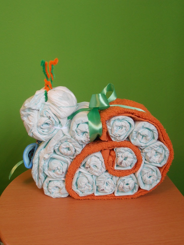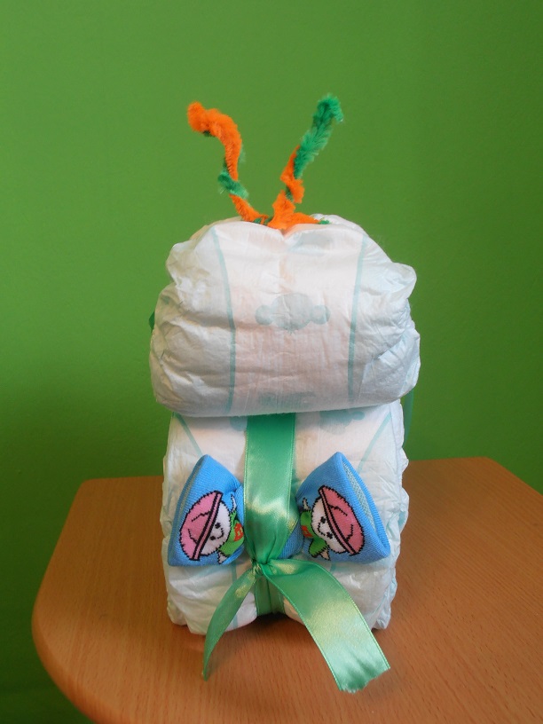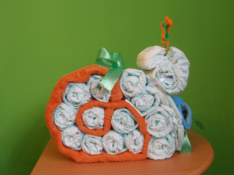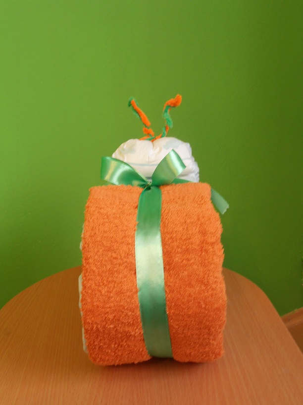 Popis torty: 16 ks plienok veľkosti midi, 1 ks uterák (50x90cm), 1 pár ponožiek