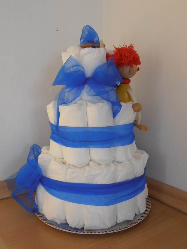 Popis torty: 40 ks plienok veľkosti midi, 1 ks panáčik - drevená hračka na strunke - vhodná na zavesenie napr. nad postieľku