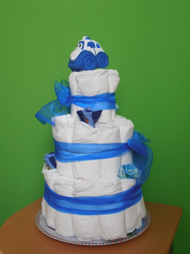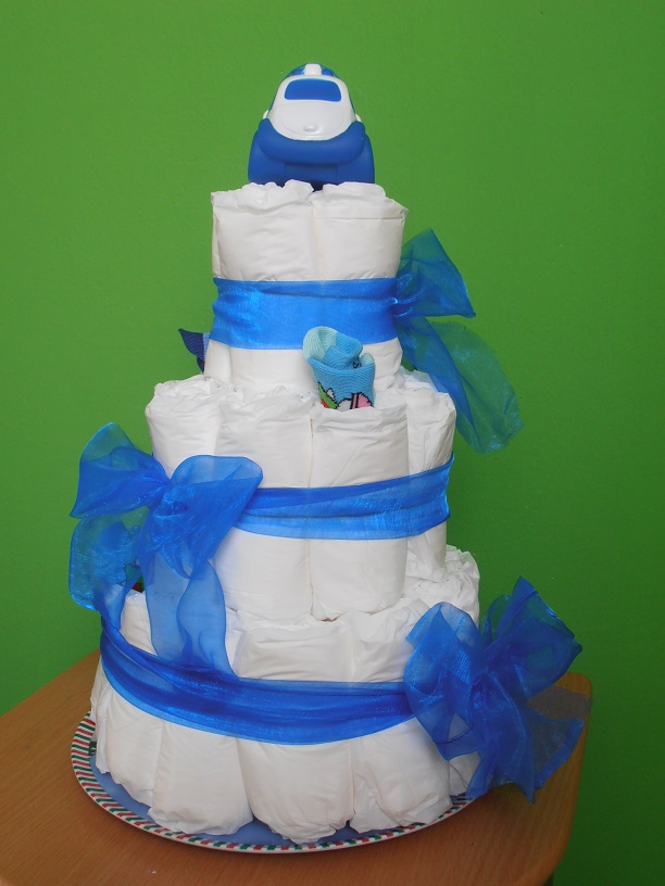 Popis torty: 40 ks plienok veľkosti midi, 2 páry ponožiek do 1 roka dieťaťa, 1 ks hračka vhodná aj do vody