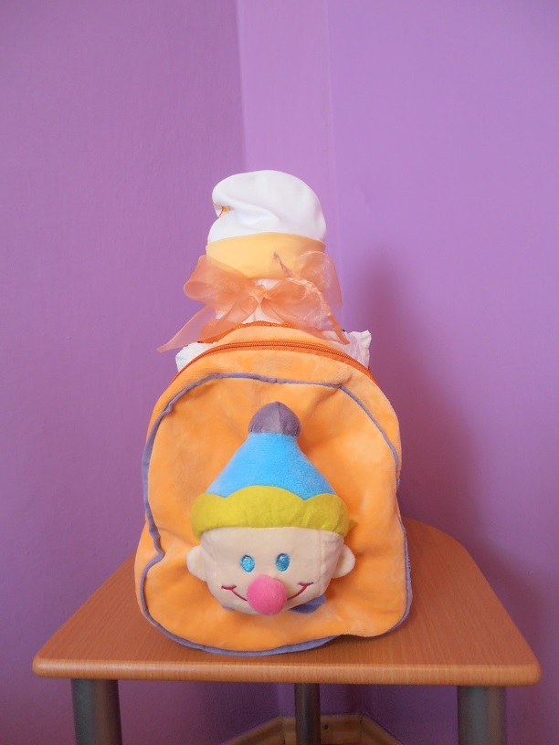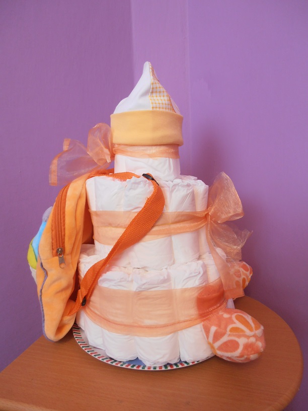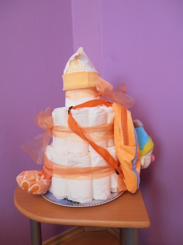 Popis torty: 40 ks plienok veľkosti midi, 1 ks čiapočka, 1 pár ponožiek, 1 ks batôžtek